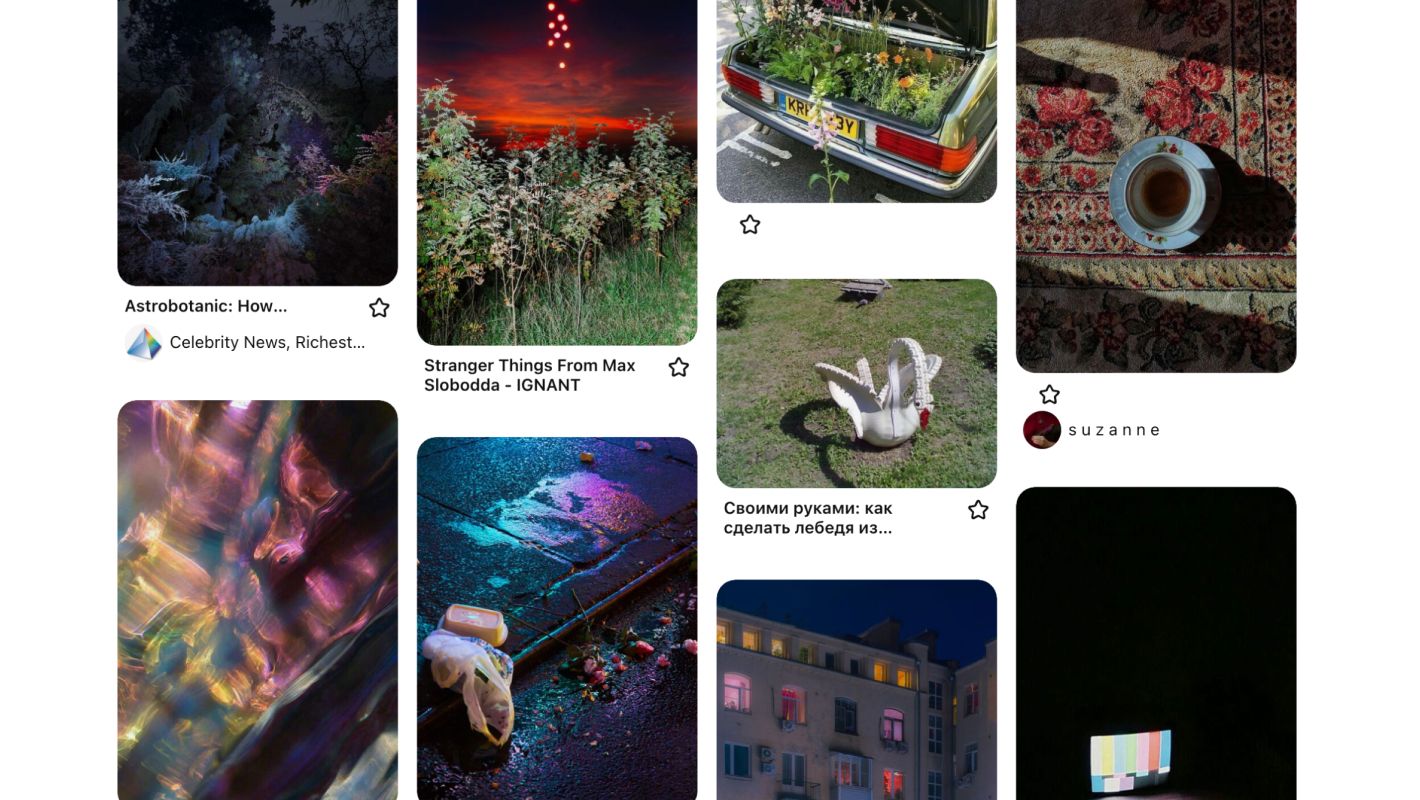 Не подвергайте изображения анализу, просто соберите как можно больше образных ассоциаций — предметов, локаций, героев, абстракций, рисунков, цветов, — а затем попробуйте скомпоновать из них целостный мудборд, убрав выбивающиеся идеи.